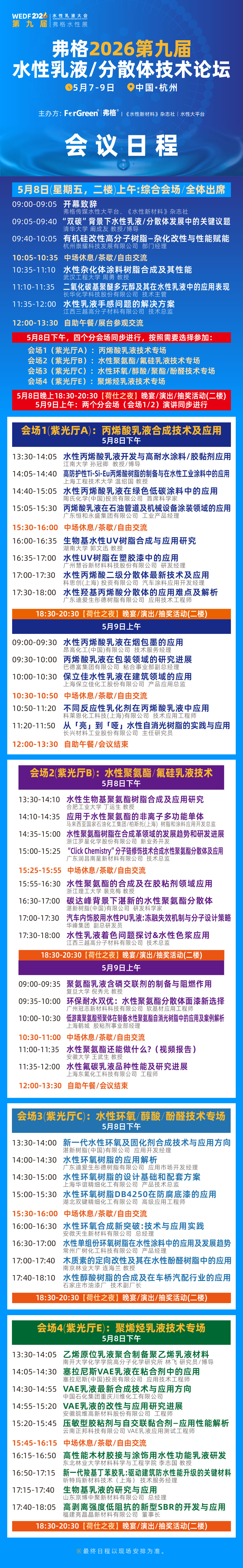 弗格2026第九届水性乳液/分散体论坛计划将于5月继续在杭州举行。本次大会将继续邀请丙烯酸乳液、水性聚氨酯、水性环氧、水性醇酸(聚酯)、乙烯基树脂乳液(PVAC、VAE、氯醋、偏氯等)、二烯烃乳液(丁苯、丁腈、氯丁等)、有机硅乳液、蜡乳液等水性乳液、水性分散体的技术专家和领先企业分享相关技术,这将是水性新材料行业的一次全面,深度的学术交流机会,也是水性产业链企业的一次全面、深入的生意撮合契机。